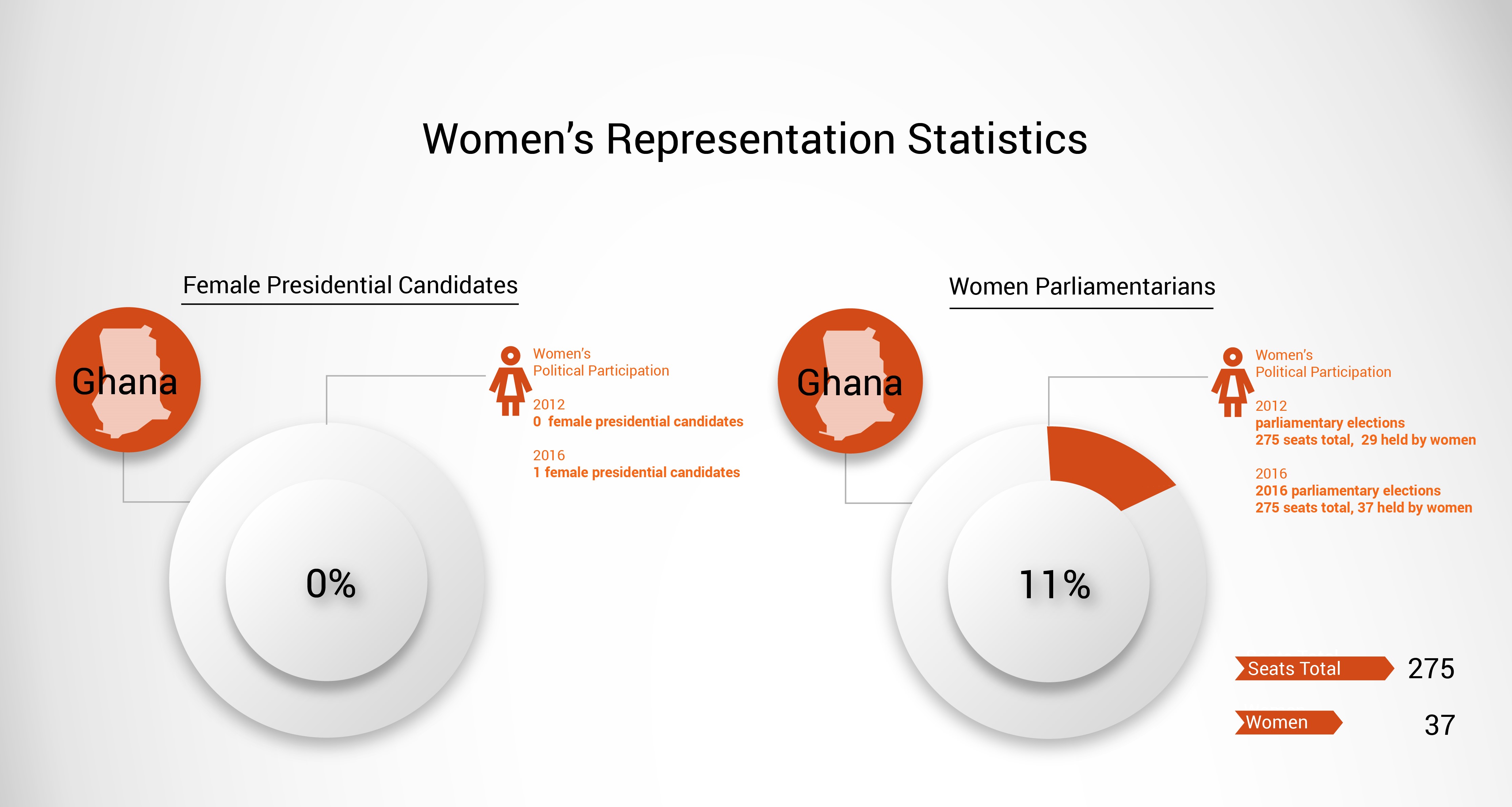 In the parliamentary elections, the women elected rose from 29 in the 2012 elections to 37. This is made up of 24 women elected on the ticket of the New Patriotic Party (NPP) and 13 on the ticket of the National Democratic Congress (NDC). Some gender activists have argued that women’s representation in the legislature was still low, still falling short of the minimum UN recommended threshold of 30%, however this is a notable increase since 1992 when 16 women were elected. There was one female candidate of the 7 candidates in the presidential election, Nana Konadu Agyeman-Rawlings, who also ran in the 2012 presidential elections, but was disqualified as her presidential forms had not been fully completed. She is a former First Lady and prominent women's rights campaigner. She received, however, only 0.16% of the vote.